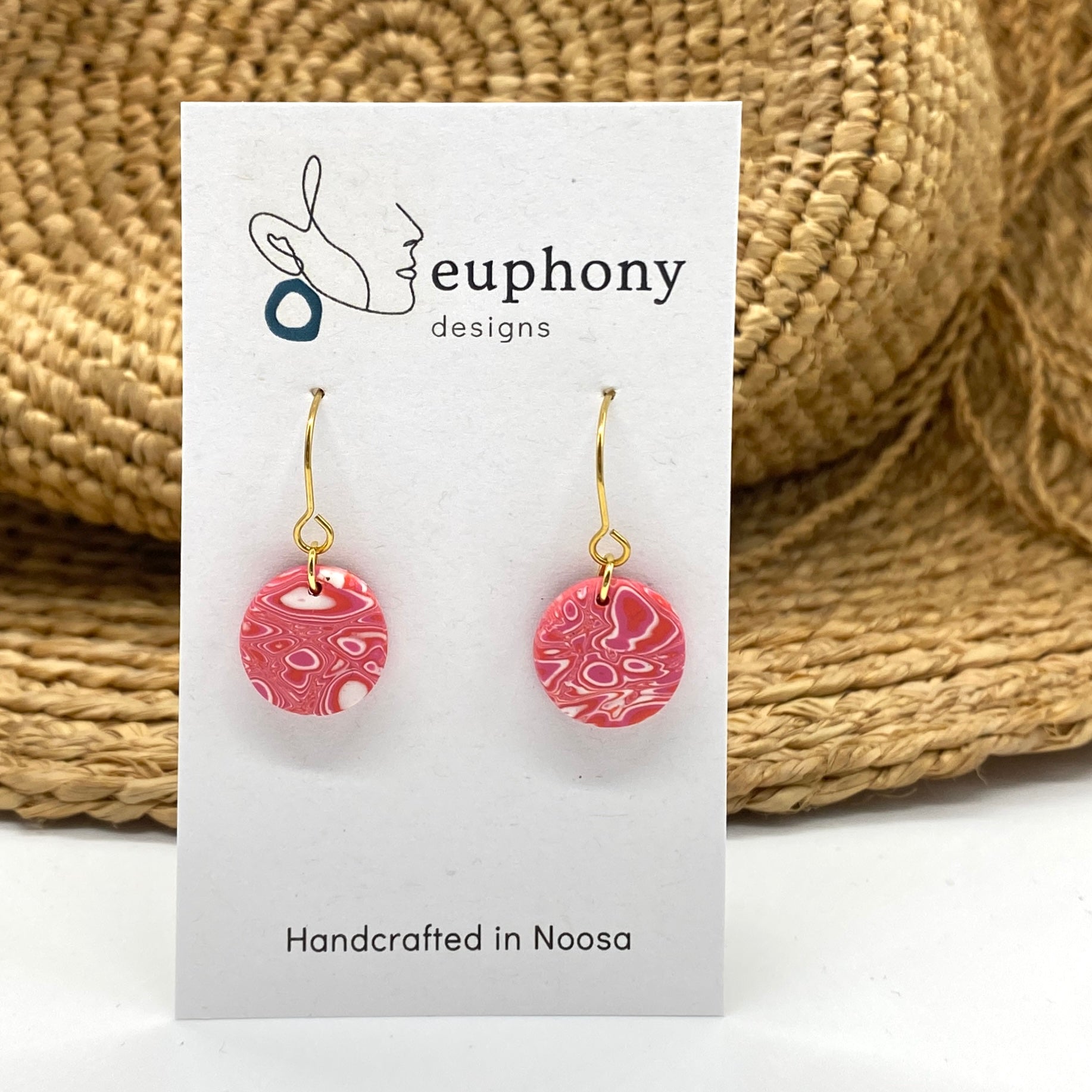 Orange and Fuchsia Collection: these dangle earrings feature large C-shaped gold hooks connected to small polymer clay circles in an intricate mokume gane pattern of swirls in orange, ivory and fuchsia pink.